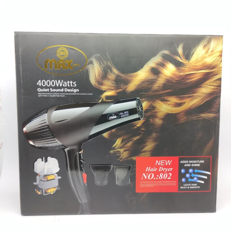 همه ما تا حدود زیادی با کارکردهای سشوار آشنا هستیم ولی داشتن یک سشوار مارک با قدرت و طول عمر طولانی میتواند جذاب باشد. پیشنهاد ما به شما سشوار مکس مدل ۸۰۲ با توان مصرفی ۴۰۰۰ وات است که مجهز به فناری تولید یون است. سشوار مکس مدل ۸۰۲ یک سشوار حرفه ای موتور سنگین (موتور ۱۷) سوپر سایلنت است که بسیار پر قدرت با تنظیم دمای سه حالته و در عین حال بسیار آرام و بی صداست.