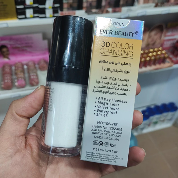 کرمپودر EVER BEAUTY 3D دارای رنگدانه های هوشمند است که با ماساژ دادن رنگ اولیه آن که سفید است به رنگ پوست تغیر شکل پیدا میکند