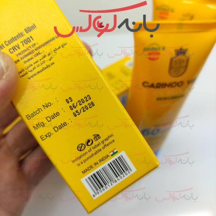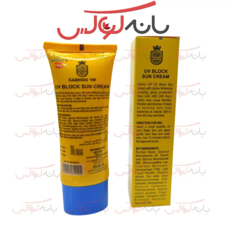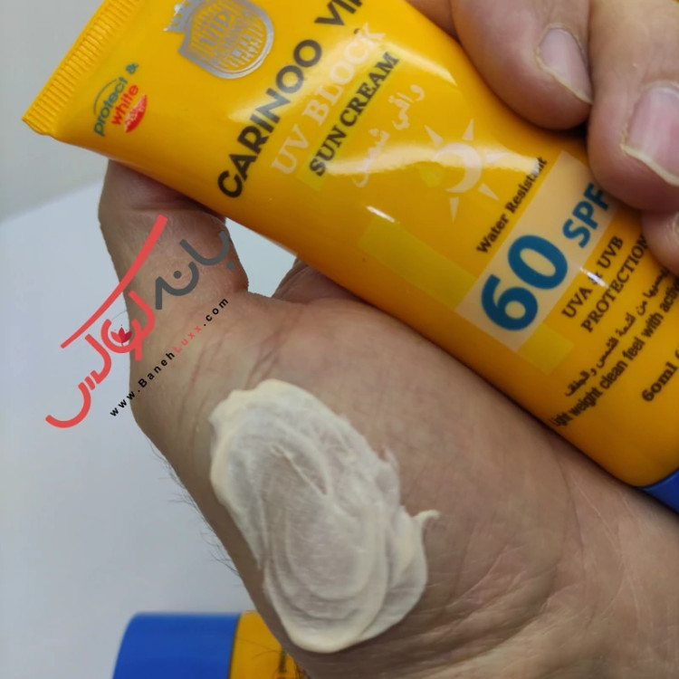 ضد آفتاب کارینو وی آی پی carino vip با spf 60 - حاوی زینک و گلیسیرین و سفید کننده کمپلکس و مواد انتی باکتریال گیاهی