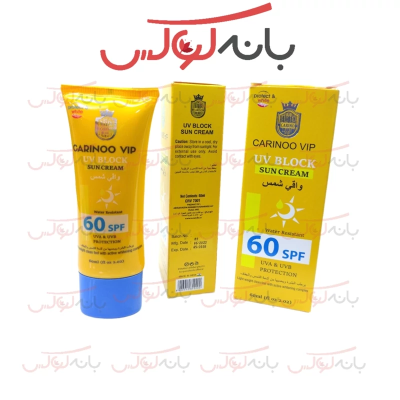 ضد آفتاب کارینو وی آی پی carino vip با spf 60 - حاوی زینک و گلیسیرین و سفید کننده کمپلکس و مواد انتی باکتریال گیاهی