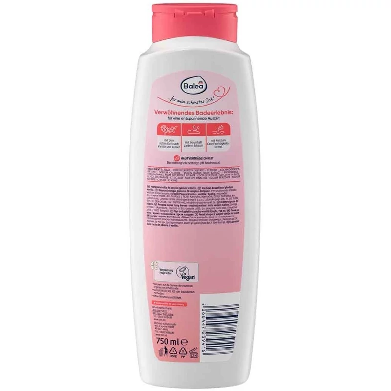 نحوه عملکرد و کارایی شامپو بدن و فوم وان باله آ به طور موثر کثیفی، چربی و ناخالصی ها را از روی پوست پاک می کند. در عین حال کفی غنی و خامه ای ایجاد می کند. گنجاندن عصاره تمشک در این فرمول خواص آنتی اکسیدانی را فراهم می کند. تمشک غنی از پلی فنول است. که از پیری زودرس پوست جلوگیری می کند. رایحه وانیل و انواع توت، به عنوان یک خوشبو کننده عالی به حساب می آید. این رایحه دلپذیر و جذاب تجربه حسی حمام کردن را افزایش می دهد. این محصول حاوی فرمول مرطوب کننده مانند گلیسیرین و کره شی است. این مواد برای آبرسانی پوست و حفظ رطوبت آن کار می کنند. PH این محصول بین 5.5 تا 7 فرموله شده است. این تعادل PH به حفظ سد محافظ طبیعی پوست و جلوگیری از اختلال میکروبیوم پوست کمک می کند. برای انواع پوست از جمله پوست های حساس سازگار است. خطر تحریک یا واکنش های نامطلوب را به حداقل می رساند.